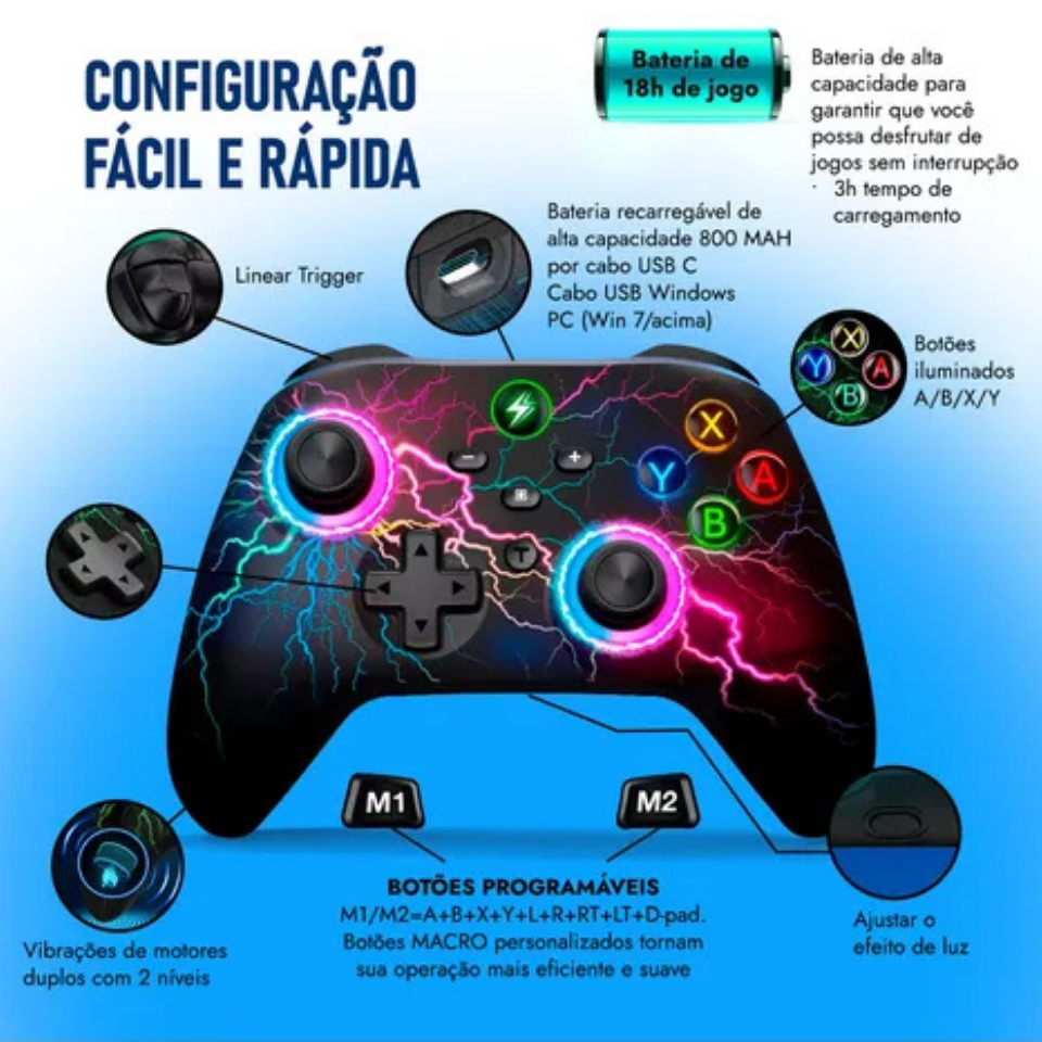 Com bateria de 800mAh, proporciona longas horas de jogo. Compatível também com smartphones, Android e IOS é ideal para gamers móveis.